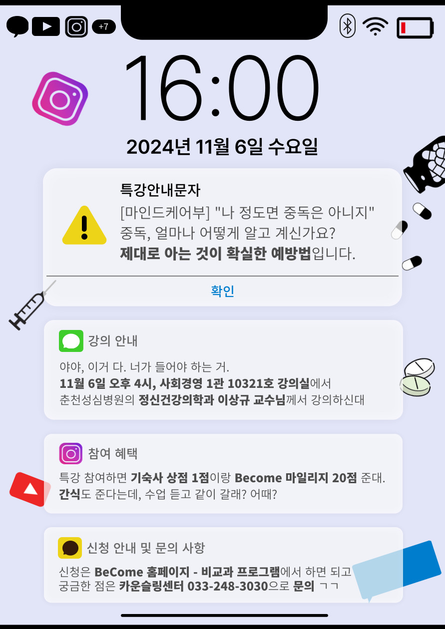 한림 BeCome 홈페이지(https://become.hallym.ac.kr/) 로그인-> [비교과프로그램] ->[마음건강특강] "나 정도면 중독은 아니지!?" 클릭! -> 하단 신청 클릭!