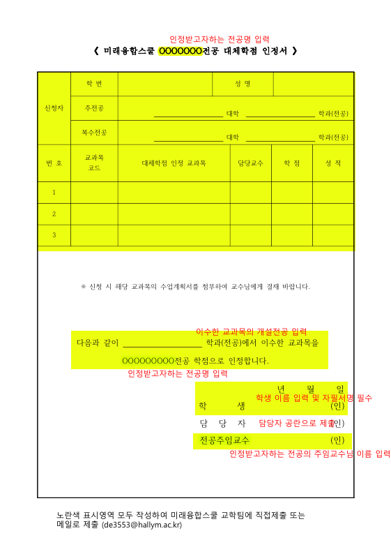 - 교수님께 상담 시, 인정 받고자 하는 교과목의 수업계획서 첨부 필수